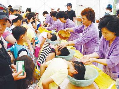 隨后,朋友陪同記者參加慶祝活動,記者看到姑娘們用菖蒲根做成簪子別在頭上,男人們則將菖蒲根纏在腰上。朋友說,這象征可以防止頭痛和災厄的發生。慶祝活動中有很多儀式,孩子用菖蒲水洗頭發,祈求健康;人們點燃許愿燈,祝愿家人平安。來自農村的民俗表演是整個活動中最熱鬧的。小伙子舞動繪有龍圖案和寫有“農者天下之大樂”等字樣的大旗,身穿韓服的人們邊敲鼓邊圍成圈跳舞,一些人則裝扮成小丑,穿插在隊伍里,場面很熱鬧,他們用這種形式表達豐收的喜悅。朋友說,端午最有代表性的娛樂活動就是女性聚在一起蕩秋千,男人聚在一起摔跤。端午當天,也有將曬干的艾葉放在大門旁邊以除災驅邪的習俗,韓國人喝菖蒲酒,還將扇子作為禮物贈送,不少商家趁此機會熱賣扇子。