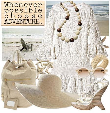 鉤編刺繡蕾絲華美連衣裙,適合海邊的優雅高貴裝扮,必備的飾品一定是寬檐草帽,墨鏡和高跟鞋。