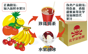 據介紹,正宗的珍珠奶茶應該是用水果為原料制成,比如椰果珍珠奶茶應該由椰子水發酵,再加入菠蘿水等混合而成。正宗的刨冰是將冰塊刨成雪花,再配以各種水果和其他配料及果汁制成,吃起來口感細膩,入口化渣。