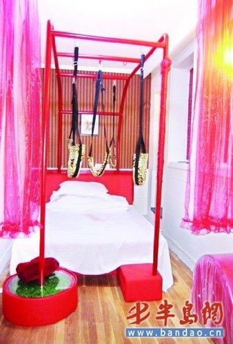 “這些床有的是電動(dòng)床,有的是水床,睡上去十分舒適的,都是我們花幾萬元進(jìn)的。床上的鐵架子上可以掛上很多秋千,情侶們可以在房間享受蕩秋千的樂趣。有的床邊還有兩根細(xì)柱子,是可以用來跳鋼管舞的。我們還進(jìn)了一批瑜伽球準(zhǔn)備這幾天充好氣放在房間里。”說罷,崔先生把五個(gè)豹紋圖案的秋千掛在床的鐵架子上,展示給記者看。