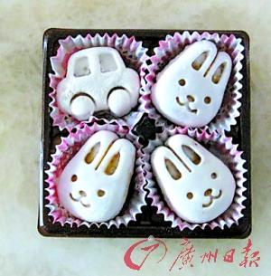 可愛的KITTY貓、卡通汽車冰皮月餅(見右圖)讓人一看就“愛不釋口”。今年,佛山一些新潮媽咪流行DIY月餅,從選購材料到“親自操刀”,DIY月餅可謂用心用力。近日,有首次DIY成功的媽咪,在Q群上大曬自己的“勝利品”,引來贊美聲一片。
