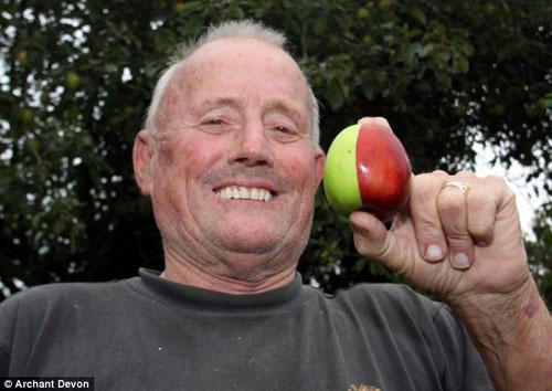 家住英國德文郡的肯·莫里斯近日無意中發(fā)現(xiàn),家中花園的蘋果樹上結(jié)了一個(gè)奇怪的蘋果:半紅半綠,而且從中間完美地區(qū)分開。老人猜想,大概有人搞了惡作劇,把他的蘋果涂成了這種顏色。