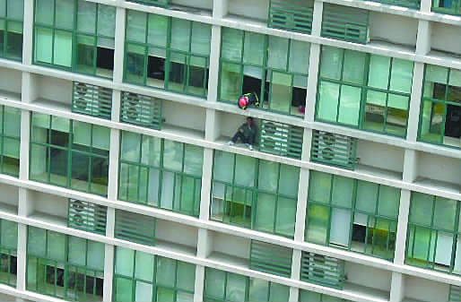昨天,在寧波老年大學7樓外墻上,一名男子蹲坐在大約50厘米寬的外墻水泥臺上,激動地打著電話。