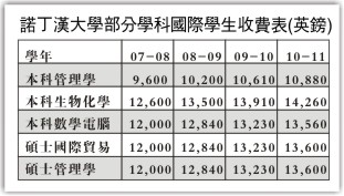 諾丁漢大學(xué)位于英國(guó)中部。由于近幾年與中國(guó)多所院校合作辦學(xué),中國(guó)留學(xué)生成批涌進(jìn)這所大學(xué);同時(shí)該校還在浙江寧波設(shè)立分校,有條件的大三學(xué)生會(huì)到英國(guó)讀書(shū)一年。記者聯(lián)系到該校的碩士研究生陳兵同學(xué),他詳細(xì)列出該校歷年來(lái)的收費(fèi)標(biāo)準(zhǔn)。今年的學(xué)費(fèi)比去年略有上漲,但增長(zhǎng)率與往年持平。他覺(jué)得這個(gè)上調(diào)的價(jià)格是合理的,中國(guó)來(lái)的同學(xué)都能接受。