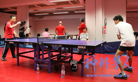 參賽的隊伍除了代表留法學(xué)子的學(xué)聯(lián)代表隊、學(xué)者隊,還有使館老師們組成的使館隊和代表華僑的嶺南隊,以及由3位留法學(xué)者子女組成的“希望隊”。本次比賽將參賽隊伍分為8個分隊,以小組循環(huán)賽方式晉級。早上9:30分,32位參賽隊員已經(jīng)開始練球熱身,安靜的球館頓時變得熱鬧起來。