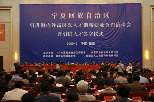 2009寧夏引進海內外高層次人才創新創業合作洽談會9月7日下午在自治區首府銀川召開。此次洽談會聘27名院士、17名專家為“自治區特聘顧問”,宣布建立8家院士工作站和11家專家服務基地。自治區政府和一些單位與柔性和全職引進的專門人才簽署了相關框架協議、共建協議和聘用合同等。