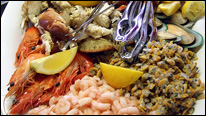 我們接受了店長的建議,從鎮(zhèn)上的小店買來面包和飲料回來,待我們歸來,位子也正好等到了,拼桌!看著菜單上豐富誘人的海鮮,我早已等不及了, 點(diǎn)了這里的招牌菜:兩人份海鮮拼盤(9.5磅每人),其中包括, 美味大蟹,深黃粉紅對蝦, 多汁鳥蛤(海扇),腌熏三文魚,對蝦,鯡魚,煙熏馬加魚,蚌和綠蚌貝,另外我們還點(diǎn)了大龍蝦,奶油蒸歐洲蠔(只有9月和4月之間可以吃到)和蔬菜沙拉。品嘗海鮮最好配以檸檬,芥末,醋,壽司醬油,和辣椒醬。 店內(nèi)提供檸檬,塔巴斯哥辣醬油和醋,如果你還想要什么配料,可以在小鎮(zhèn)的店上找到。