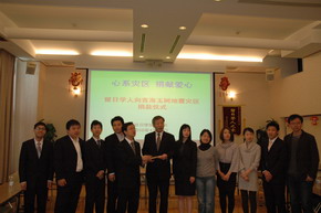 中新網4月21日電 據《日本新華僑報》報道,青海玉樹地區發生7.1級強烈地震后,廣大留日學人通過各種媒體密切關注抗震救災情況、關注災區的同胞命運。4月18日上午,全日本中國留學生學友會會長胡昂以及東京大學、東京工業大學、筑波大學、早稻田大學、慶應大學、東京海洋大學、千葉大學、日本大學等8所大學的中國留學生學友會會長來到教育處,將留日學子為青海省玉樹地震災區募集的第一批賑災款60萬日元送到了教育處。中國駐日本大使館公使銜參贊孫建明代表教育處接受了來自留日學子的第一筆愛心捐款。
