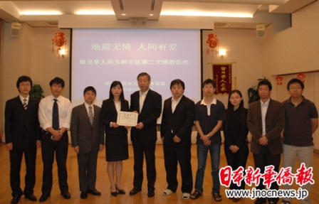中新網(wǎng)那個(gè)5月28日電 據(jù)日本新華僑報(bào)網(wǎng)報(bào)道,5月25日上午,全日本中國留學(xué)生學(xué)友會(huì)副會(huì)長韓冰以及東京大學(xué)、東京工業(yè)大學(xué)、早稻田大學(xué)、埼玉大學(xué)、東京海洋大學(xué)、千葉大學(xué)、日本大學(xué)等7所大學(xué)的中國留學(xué)生學(xué)友會(huì)會(huì)長和代表來到教育處,將留日學(xué)子為青海省玉樹地震災(zāi)區(qū)募集的第二批賑災(zāi)款送到了教育處。第二批捐款總計(jì)日幣2,861,295元、人民幣1,000元。孫建明公使銜參贊代表教育處接受了來自留日學(xué)子的第二筆愛心捐款。