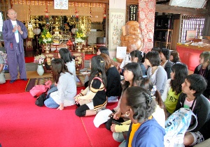 “四國大島心靈故鄉會”矢野都林會長首先在村上水師的菩提寺和高龍寺(今治市吉海町名)迎接了大家,并給大家介紹了四國大島的基本情況;隨后,留學生們步行6公里,走訪了38所名剎;夜里,大家就寄宿在島上的民居旅館“善根驛站”,晚餐則品嘗到了島上志愿者親手制作的美味。