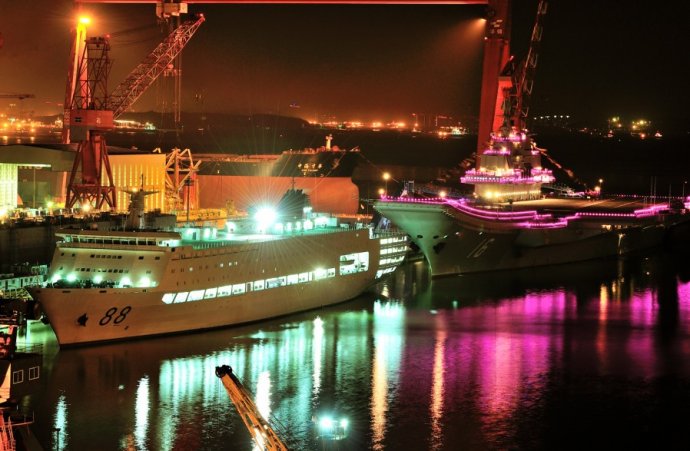 “遼寧艦”節日期間霓虹燈閃亮裝點海灣