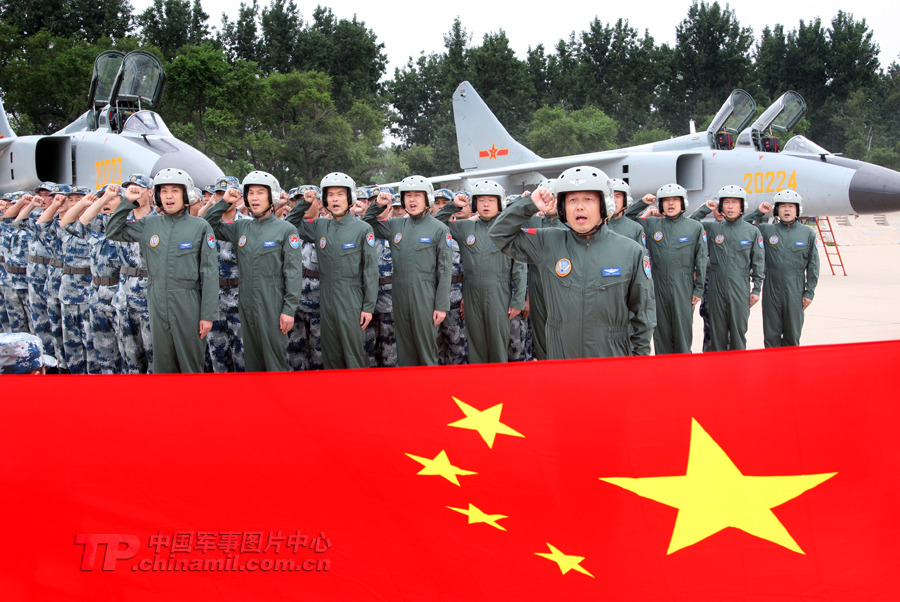 7月27日,參加中俄聯演的空軍戰斗群官兵出征前在國旗前集體宣誓,立志圓滿完成聯演任務,為祖國爭光。 曹占禮 攝(來源:中國軍網)