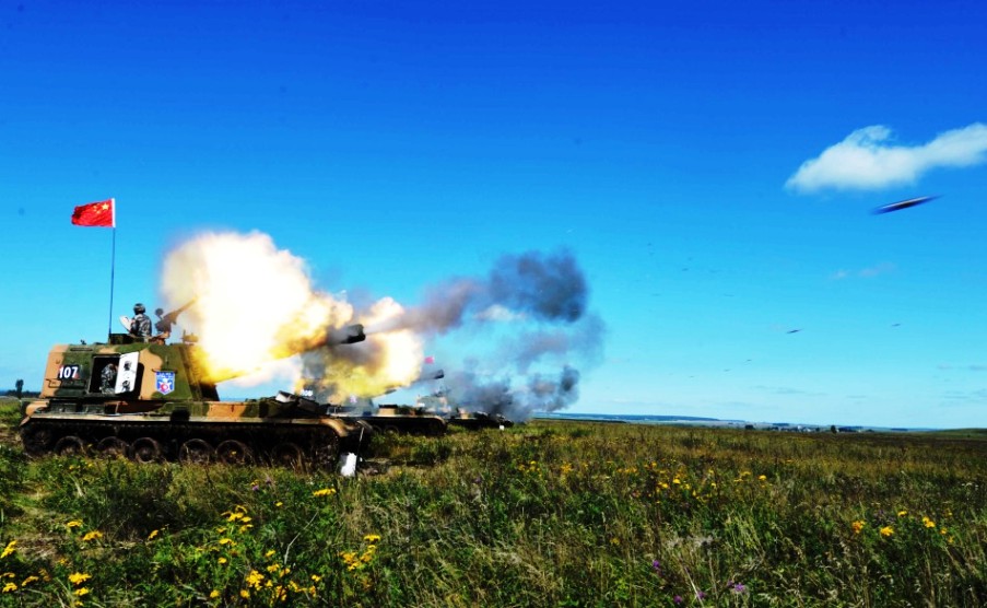 解放軍重炮群齊射火力掩護中俄參演部隊