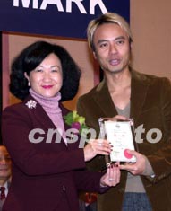 歌星李克勤1月21日在香港出席“第五屆香港安全標志證書頒獎典禮”,他從香港特區保安局局長葉劉淑儀手中接過委任狀,成為2003年度之“產品安全大使”,將協助宣揚產品安全訊息。中新社傳真 鄧慶樂 攝