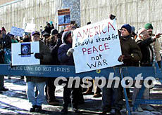 一月二十七日聯合國武器監測、核查和視察委員會主席布利克斯和國際原子能機構總干事巴拉迪向安理會提交對伊武器核查報告,與此同時,聯合國大樓外近百名反戰人士舉著反戰標語高喊“不要戰爭”,反對美國對伊開戰。作者:趙海燕