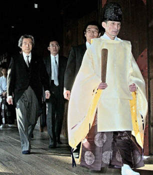 2001年8月13日,日本戰敗紀念日前兩天,小泉第一次參拜靖國神社。他的第二次參拜是在2002年4月。此舉同樣遭到亞洲各國的譴責。(章田)