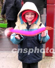 農歷新年,英國曼徹斯特唐人街舉行盛大賀歲活動,圖為英國小童饒有興趣地玩“中國龍”。 盧峰 攝