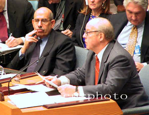 聯合國監測、核查和視察委員會主席布利克斯(右)和國際原子能機構總干事巴拉迪(左)二月十四日上午再次向聯合國安理會提交核查報告。(作者:趙海燕)