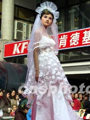 二月十六日,北京西單一家婚紗影樓借情人節刮起的浪漫旋風,不失時機地舉辦了一場婚紗秀,吸引了不少觀眾。作者:杜洋