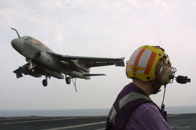 EA-6B“徘徊者”(Prowler)全天候電子作戰機通過其攜帶的反輻射及干擾導彈對敵方雷達、電子通訊設備實施打擊及干擾,從而為美陸、海、空三軍提供無干擾作戰保障。該機型是以A-6“入侵者”戰斗機的架構改造而來。由美國諾斯羅普格魯曼航空航天公司制造,1971年進入海軍服役。