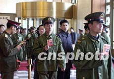全國政協(xié)委員二十七日陸續(xù)抵京,北京人民大會堂安檢測試工作進入最后階段。圖為解放軍工作人員手持兩會有效證件在大會堂內(nèi)進行安檢測試。作者:廖文靜