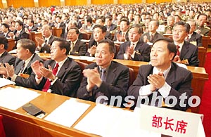 第十屆全國人民代表大會第一次會議五日在北京人民大會堂開幕,列席大會的部長們鼓掌盛贊朱總理的政府工作報告。作者:毛建軍