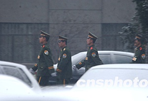 三月六日清晨北京瑞雪紛飛,在全國人大十屆一次會議駐地的軍警冒雪巡邏。作者:賈國榮