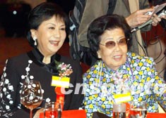 香港電影界著名前輩夏夢(左)三月六日晚盛裝出席此間舉行的慶祝國際婦女節活動,圖為夏夢與孔愛菊談笑甚歡。潘索菲 攝