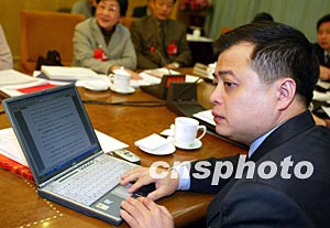 全國人大代表、浙江正泰集團公司董事長南存輝,七日在浙江代表團審議會上使用電腦修改發(fā)言稿。在今年的人代會上,很多代表都是攜帶電腦參會。作者:毛建軍
