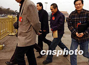 全國政協影視界的委員們掩護張藝謀將其掩護在中間,三月十三日快步走過天安門廣場,去參加全國政協的選舉大會。作者:賈國榮