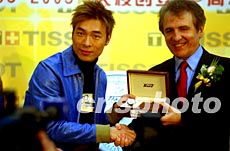 瑞士天梭表TISSOT全球總裁弗朗索瓦·添寶(右)十四日在上海新天地向香港明星許志安(左)贈送名表,由此展開其世界巡回展中國大陸地區第一站。作者:劉殊瑾