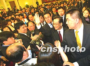 十屆全國人大一次會議十八日在北京人民大會堂閉幕,溫家寶在記者招待會后,欣然走下臺與記者們打招呼,引起現場混亂。作者:毛建軍