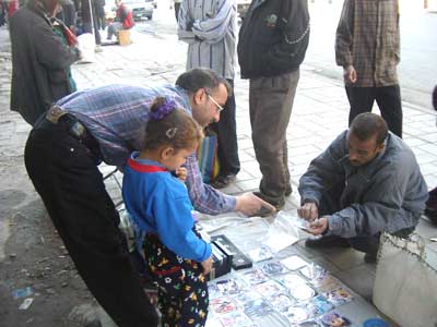 巴格達市民在買盜版美國大片VCD,大概4元人民幣一張。(春風)