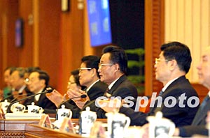 十屆全國人大常委會一次會議十九日在北京舉行,全國人大常委會委員長吳邦國及新當選的副委員長們出席。作者:滿會喬