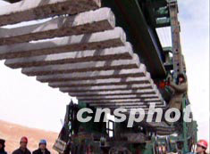 青藏鐵路鋪架工程十三日下午成功跨越地震斷裂帶,抵達海拔四千七百多米的昆侖山埡口,至此青藏鐵路鋪架已達一百五十公里。中新社 圖