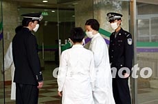 北京警方在五月建成的北京小湯山醫院設立警戒線,保證收治“非典”患者重點醫院的良好秩序。圖為警員檢查出入人員的證件。作者:劉永生