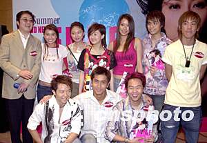 歌星黃伊汶5月21日在香港舉行新歌MV〔戒男〕首播禮,環球唱片高層陳小寶(左一)率領旗下眾歌星出席為黃伊汶打氣造勢。鄧慶樂 攝