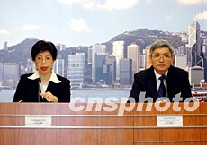 香港衛生署長陳馮富珍及醫院管理局行政經理劉少懷,5月22日在記者會公布新增3宗SARS個案,當中沒有醫護人員,再有3名女病人死亡。另外有10名康復者出院,香港至今已連續7天錄得少于5個SARS感染病例。洪少葵 攝