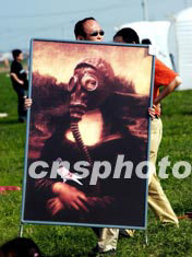 一名北京藝術家捧出戴防毒面具的《蒙娜麗莎》油像新作,參加京郊五月下旬抗擊“非典”為主題的“藍天不設防”藝術行動。中新社記者:鄒憲