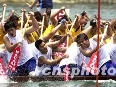 在一日舉行的2003年澳門國(guó)際龍舟賽澳門女子公開賽中,女選手巾幗不讓須眉,奮勇爭(zhēng)先。 中新社記者 李剛