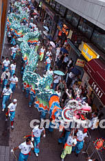 六月十五日在香港舉行的千人舞龍舞獅大巡游中,一條二百五十尺長龍穿街走巷,成為活動中一道亮麗風景。潘索菲 攝