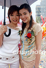 香港小姐左慧琪(右)和胡家惠六月十五日在香港冒雨觀看千人舞龍舞獅大巡游。潘索菲 攝