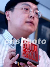 一尊清朝康熙皇帝的極品交龍紐碧玉璽“康熙御筆之寶”從海外回流,六月二十五日在北京亮相,將參加因抗擊非典推遲到七月中旬舉行的華辰春季拍賣。此璽可能在“八國聯軍”侵華時被掠出清宮,歷盡滄桑,因而今朝難以估價。中新社記者:賈國榮