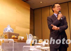 香港佳士得2003年春季拍賣會之《中國宮廷御制藝術精品》因受SARS影響延遲至7月7日舉行,亞洲區主席林華田6月26日介紹一套珍貴的清朝康熙御用田黃玉石印章,估價成交逾二千萬港元。中新社記者 洪少葵
