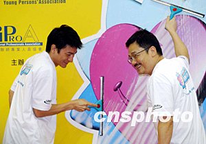 6月28日,香港著名藝人劉德華與漫畫家黃玉郎應邀出席擦亮香港大行動-“義”氣青年發動儀式,為百多名青年義工鼓勵打氣。作者:洪少葵