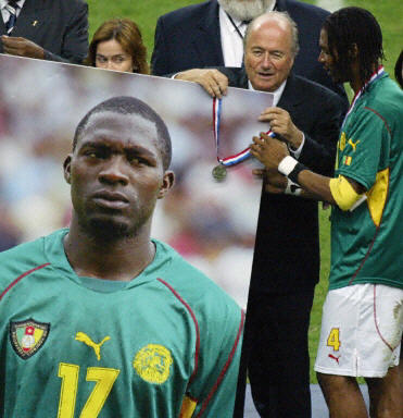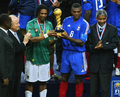 圖為賽后法國隊隊長德塞利、喀麥隆隊隊長宋共舉冠軍金杯。
