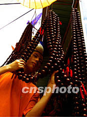 六月三十日,一名小男孩在北京一處寺廟旅游圣地選擇旅游紀念品。北京旅游“禁令”解除后,旅游紀念品攤點爭相開業,以減少“非典”造成的損失。中新社記者 宋吉河 攝