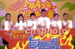 香港「2003年青少年暑期活動(dòng)」7月2日舉行記者會(huì),民政事務(wù)總署署長(zhǎng)陳甘美華(左三)、與青少年暑期活動(dòng)委員會(huì)主席陳振彬(左四)等人與活動(dòng)大使Twins蔡卓妍(右一)及鍾欣桐(左一)攜手主持揭幕亮燈儀式。鄧慶樂(lè) 攝