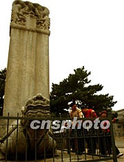 七月四日,中國北京明十三陵作為明清皇家陵寢的擴展項目被列入世界文化遺產(chǎn)名錄,一時吸引不少游人前來參觀。圖為游客對十三陵中定陵前的石碑產(chǎn)生濃厚興趣,明十三陵每處皇陵前都有類似烏龜馱石碑的石雕。中新社記者 宋吉河 攝
