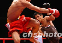 四日晚,因“非典”停賽近三個月之久的中國武術散打王爭霸賽在北京重燃戰火。中新社記者:武仲林